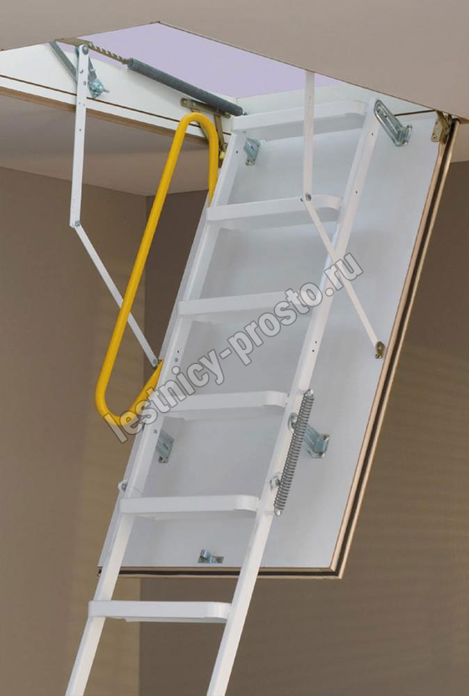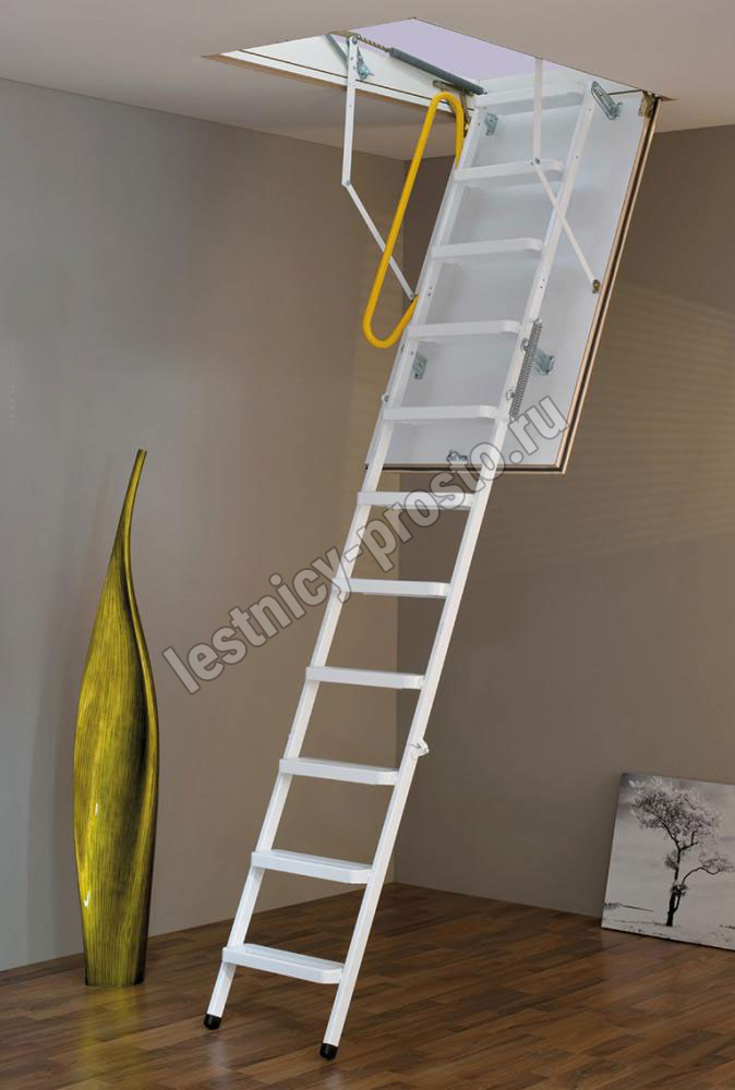 Износоустойчивая лестница для холодных помещений, приспособлена, как для частого использования так и для продолжительного простаивания. Белый цвет крышки люка (толщина 3,3 см) гармонично интегрируется в интерьер помещения и закрывается, маскируясь в один уровень с потолком.