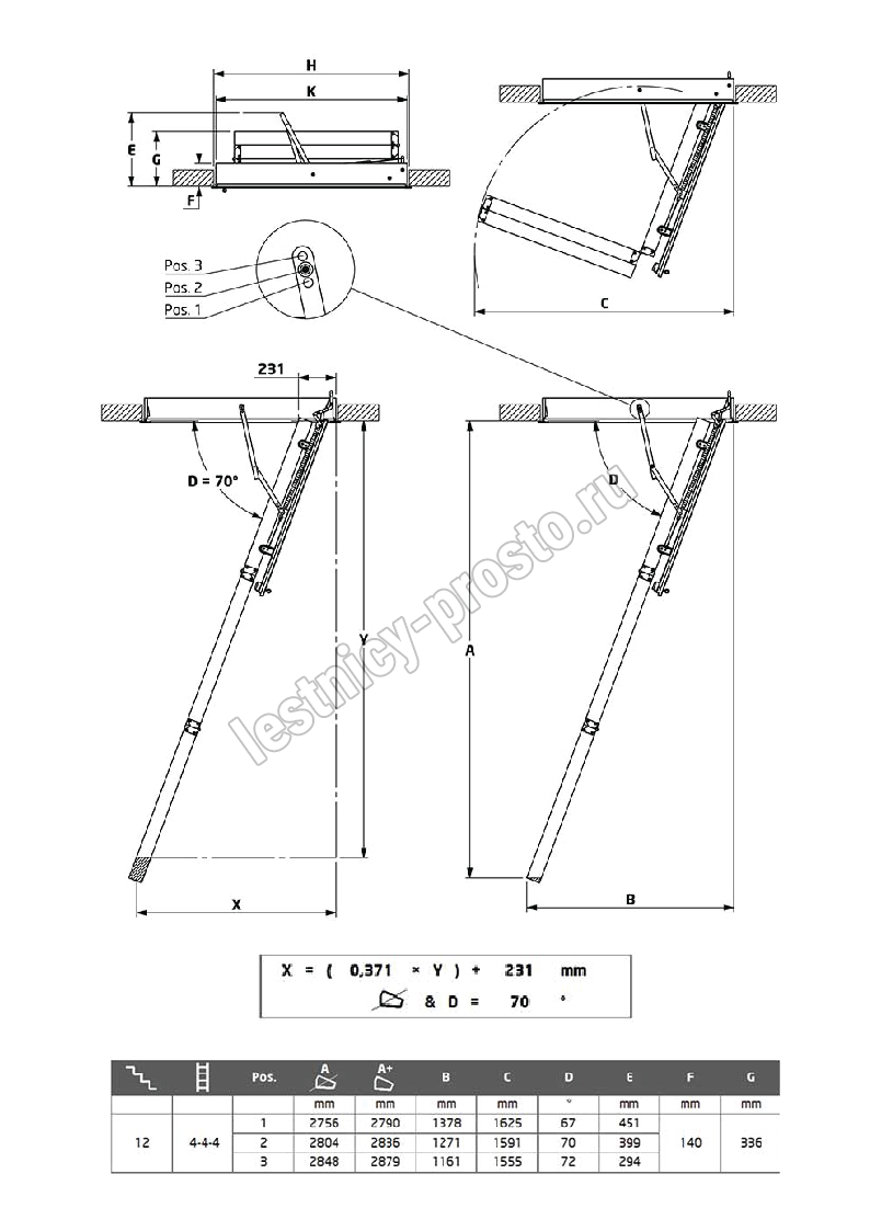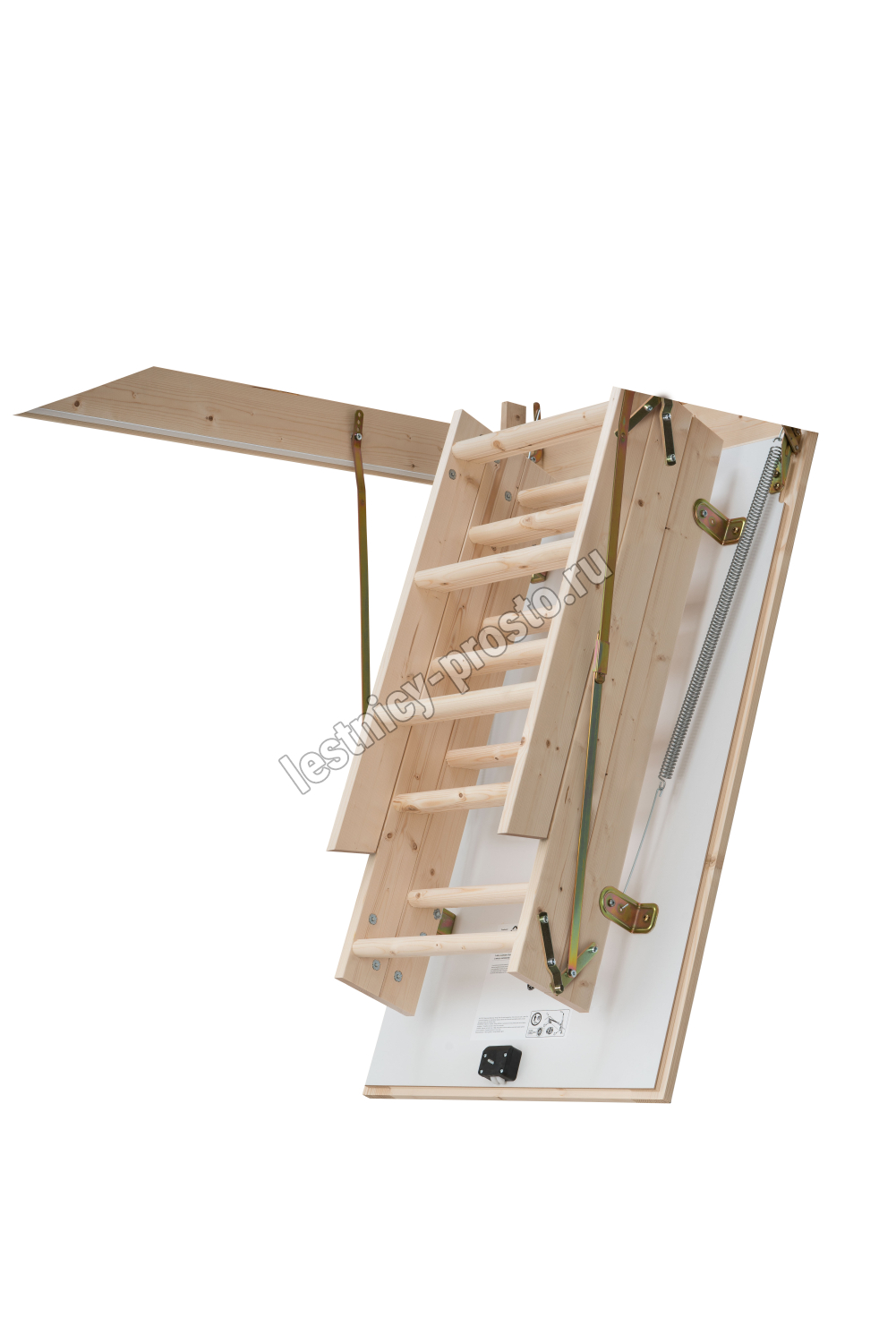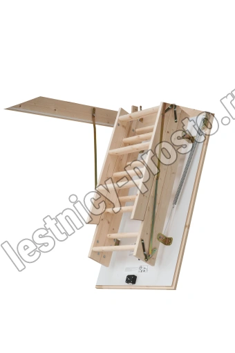 В комплекте: люк из сэндвич-панели, пружинный механизм "короб-люк", короб, трехсекционная лестница с сосновыми ступенями, замок люка, штанга для раскладывания лестницы.
