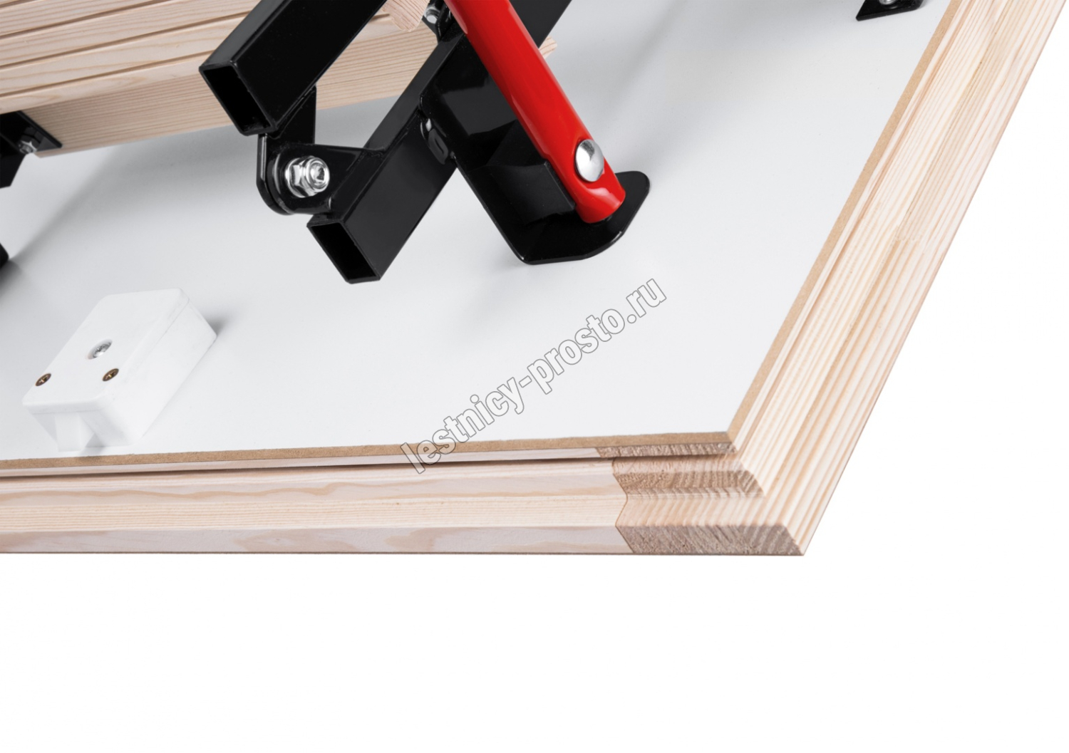 Термоизоляционная крышка имеет усиленную теплозащиту, облицована с двух сторон ДCП белого цвета. В комплекте деревянный стержень для открывания, металлический поручень и защитные накладки на ножки. Лестница идеальна для прохода на холодный чердак.