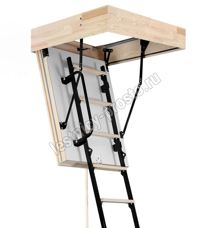 Складная 4-х секционная чердачная лестница. Ступени выполнены из сосны, имеют противоскользящие насечки, направляющие из металла