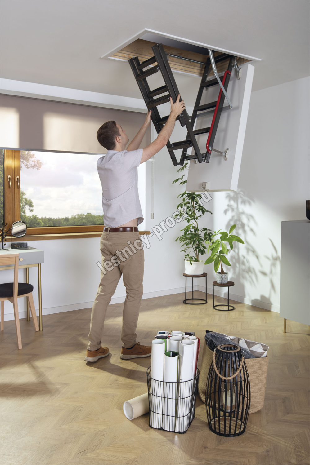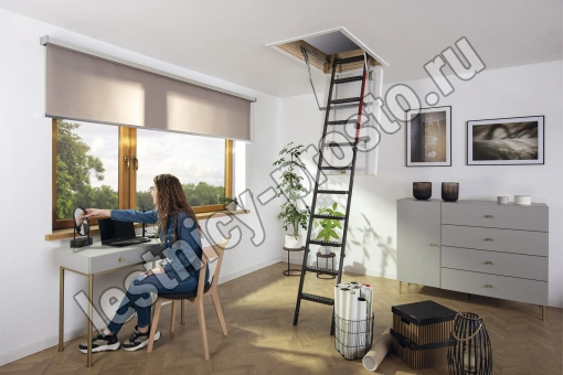 Лестница представляет собой складную конструкцию из металлического лестничного марша и термоизоляционного люка.
