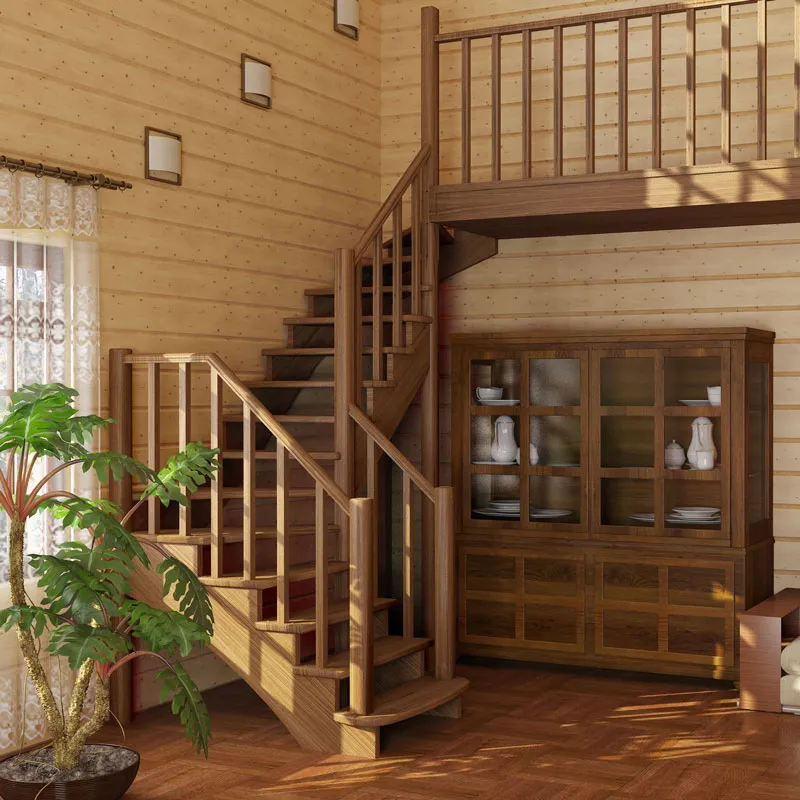 Ступени и поручень изготовлены из дуба, остальные элементы лестницы из сосны.