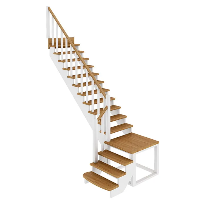 Лестница поставляется в разобранном виде, упакованной в два ящика. Базовый комплект включает в себя деревянные элементы лестницы, подступенки и ограждения без какого-либо покрытия.