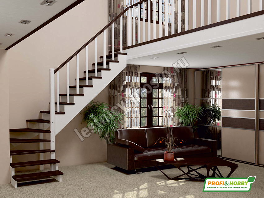 Базовый комплект включает в себя деревянные элементы лестницы и ограждения без какого-либо покрытия. Вы можете заказать у нас покраску лестницы в цвета, отвечающие особенностям вашего помещения.