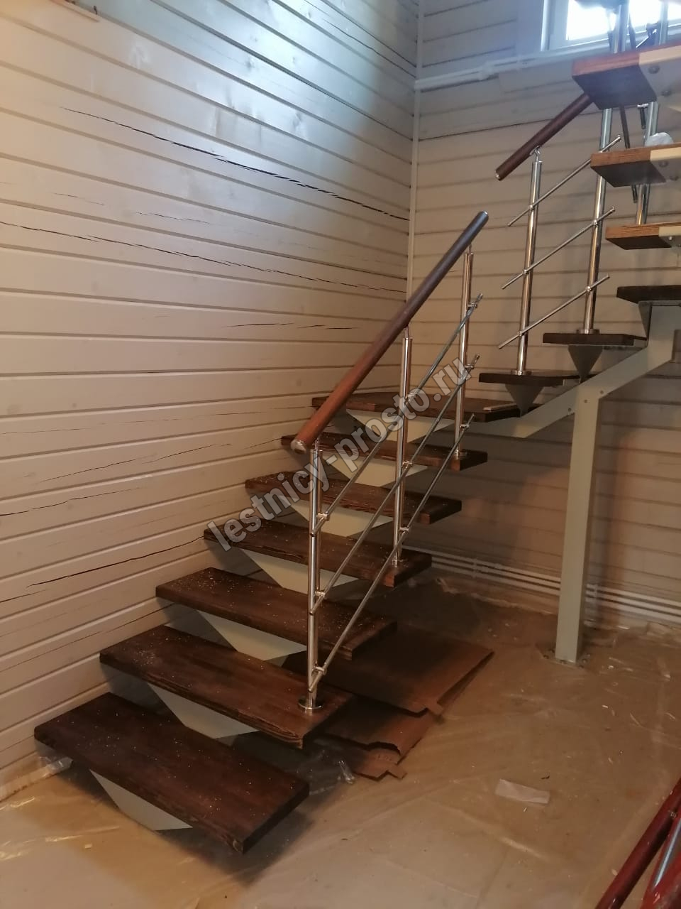 Конструкция представляет собой стальной монокосоур, на который крепятся ступени из выбранной породы дерева.