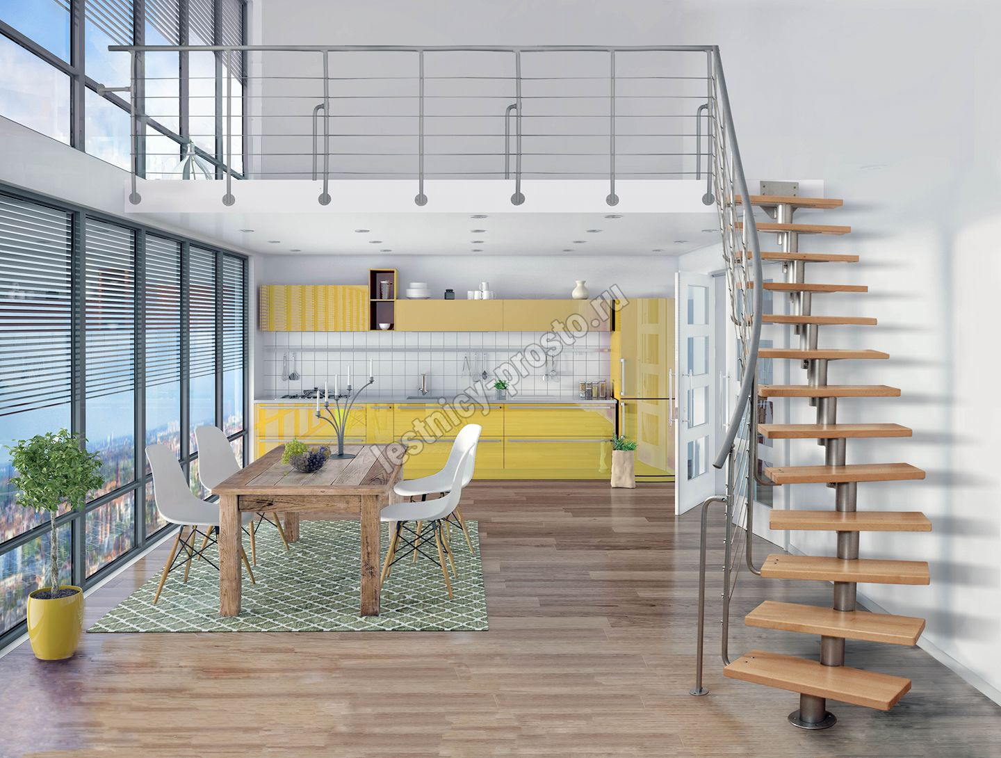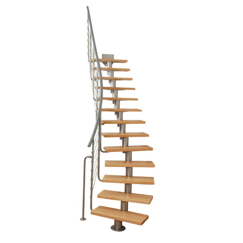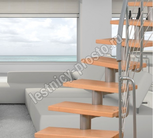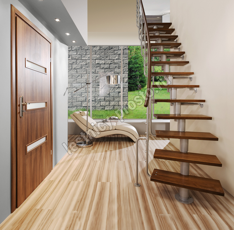 Лестница на стальном модульном каркасе. Высота лестницы регулируется при сборке засчет регулировки высоты шага. Ступени покрыты защитным лаком. Ограждение из стали с пластиковым поручнем. В комплект входят перила с вертикальными стойками и горизонтальными перегородками. Изделие поставляется с шурупами (кроме потолочных и напольных анкеров), инструкциями по монтажу и эксплуатации и гарантией. Внимание! Для этой лестницы необходимо крепление к стене.