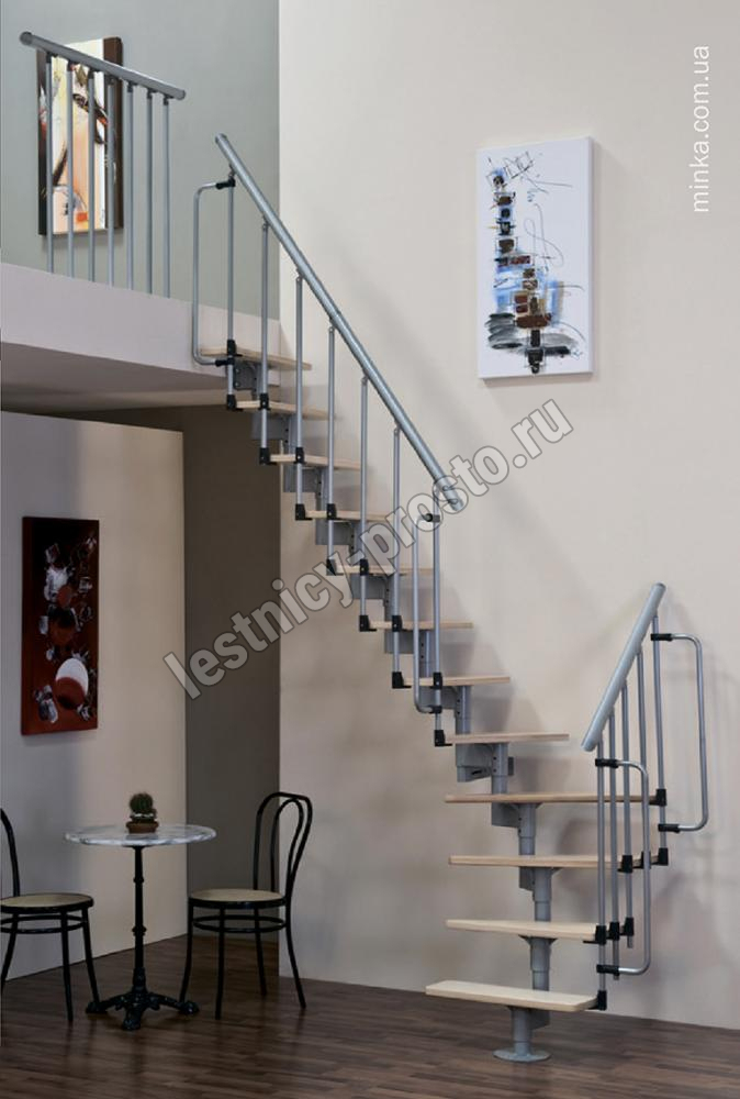 Алюминиевый поручень лестницы Joker 600 покрыт порошковой краской в цвет конструкции. Ступени изготовлены из берёзы и покрыты защитным износостойким фирменным лаком MINKA.