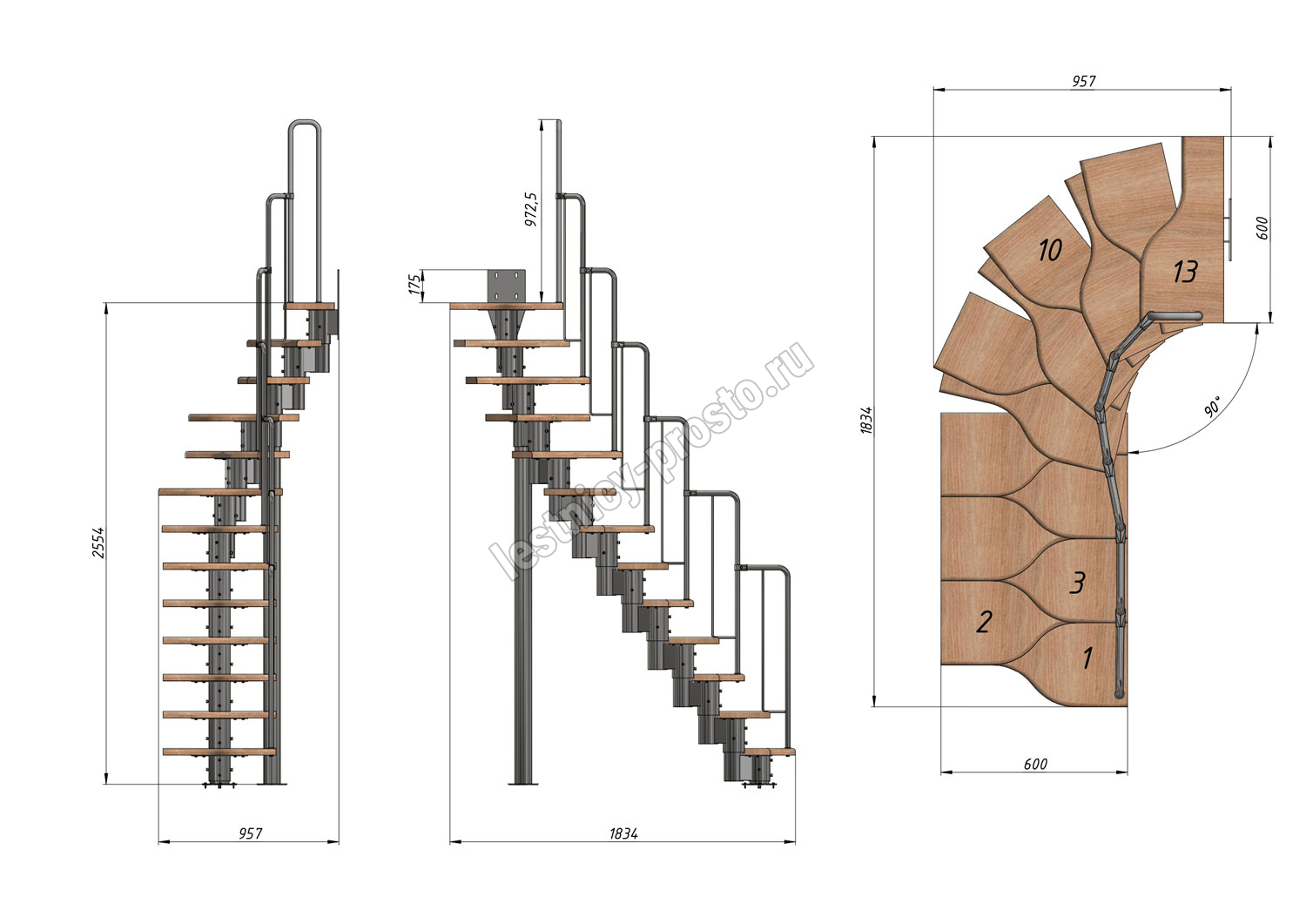 Лестница Prosto Urban Black гусиный шаг 600 мм, h234-336 см (13 ступеней), бук