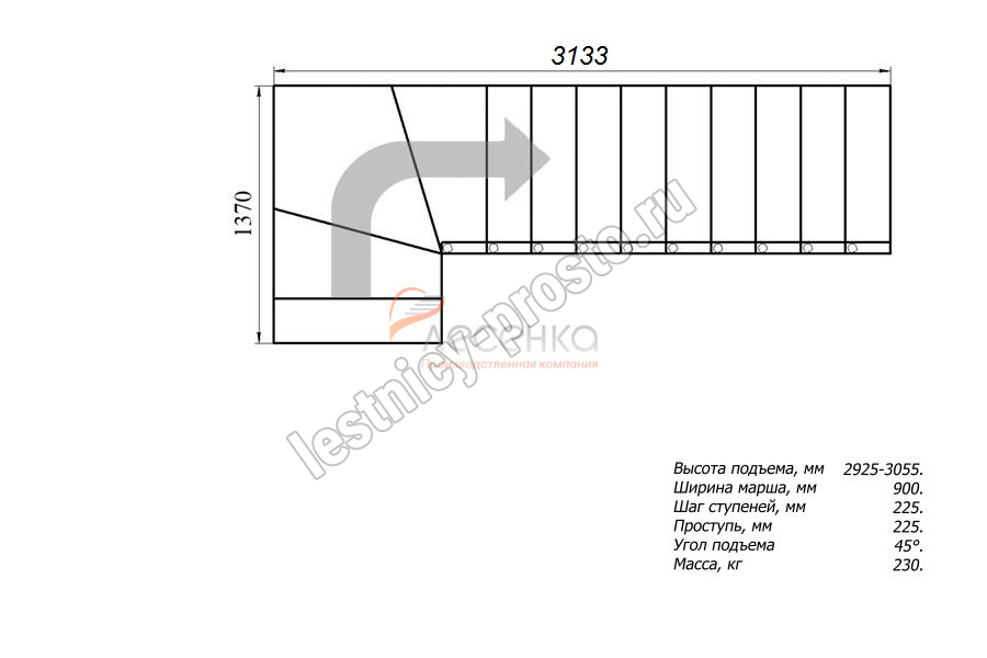 Модульная лестница Фаворит 225 2925-3055, Серый, Сосна, Крашеная, Без Ступений