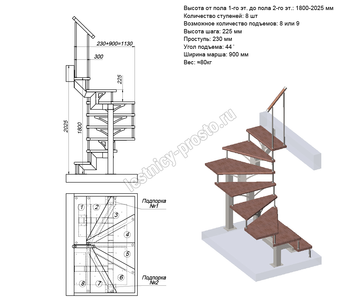 | Лестница PROSTO MONO П-образная, h225 см, ступени хвоя |