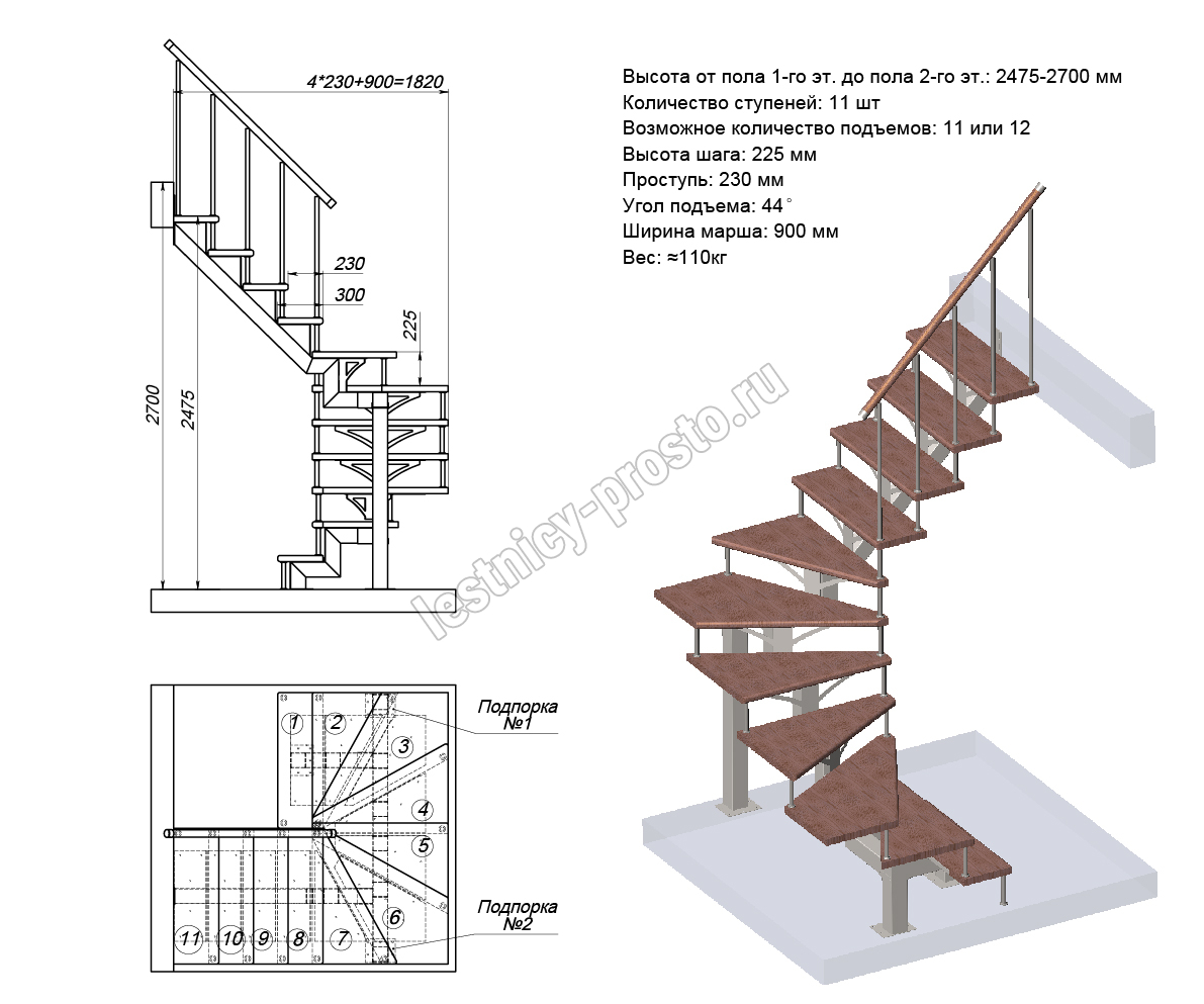 | Лестница PROSTO MONO П-образная, h270 см, ступени хвоя |
