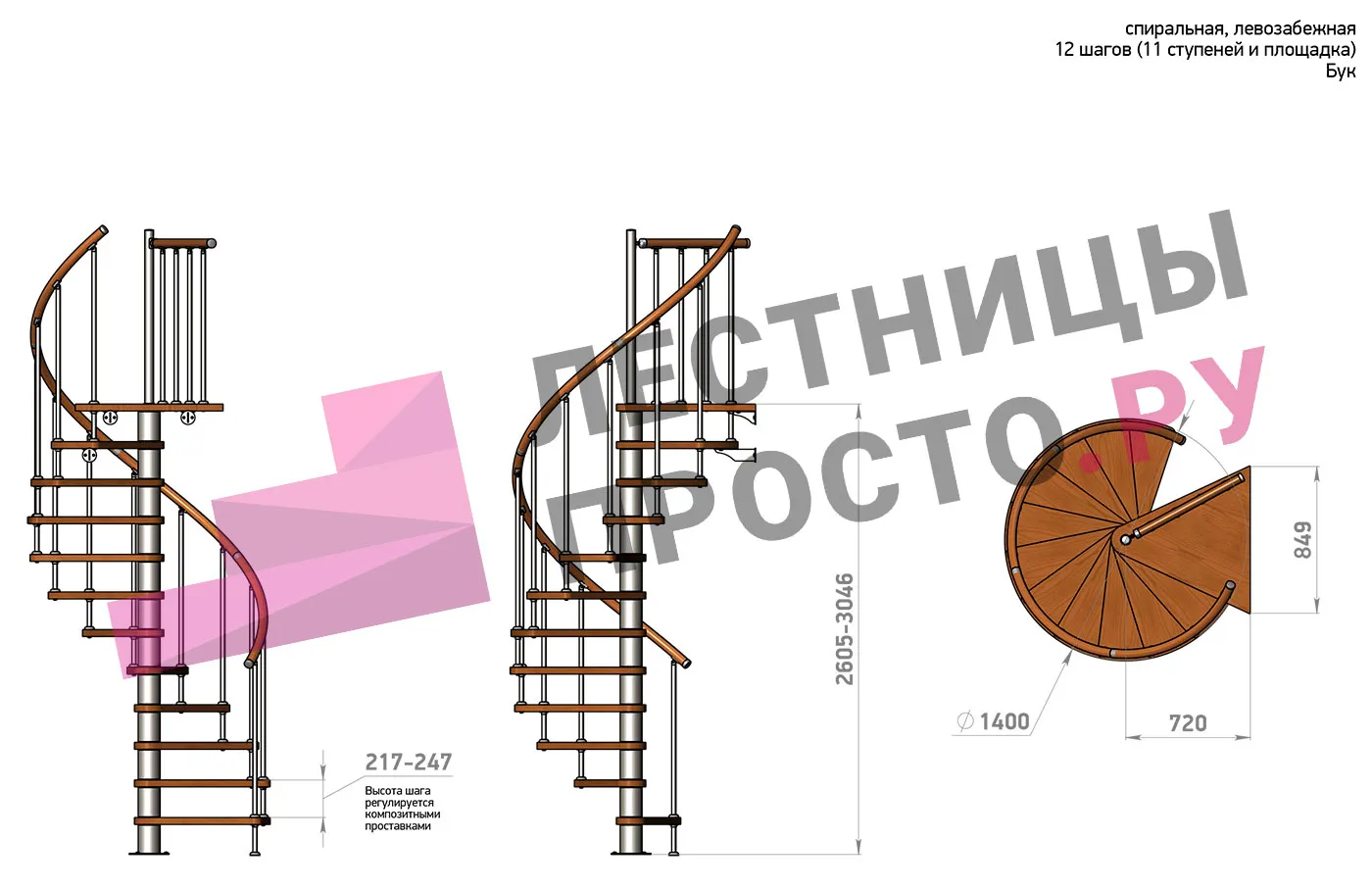 Винтовая лестница Prosto Spiral Black D140см, h260.5-304.6 см, бук