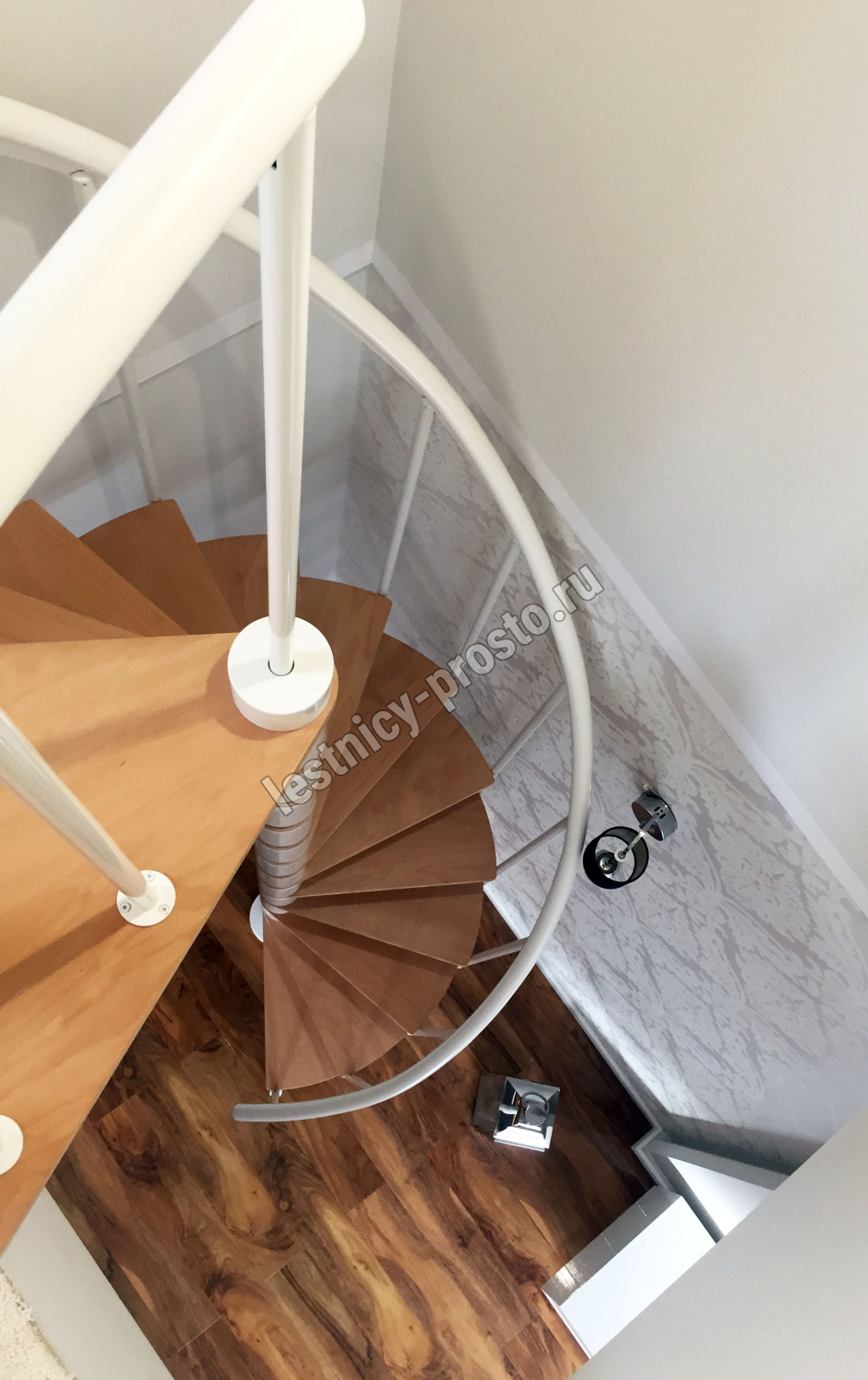 Ступени лестницы изготовлены из бука по технологии MULTIPLEX и покрыты износостойким защитным лаком. Лестница монтируется как по часовой стрелке, так и против. Возможен монтаж в круглый или квадратный проём. Ограждение: стальные трубки, Ø25 мм RAL 9016. Поручень: гибкий цельный ПВХ-поручень Ø40 мм белого цвета. Конструкция и балюстрада окрашены порошковым способом в белый цвет (RAL 9016).
